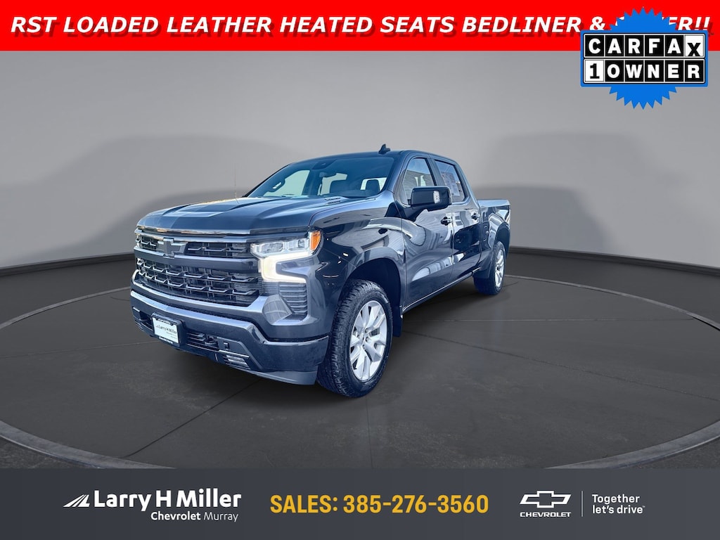 CARFAX One-Owner.Priced below KBB Fair Purchase Price!Odometer is 8844 miles below market average!2023 Chevrolet Silverado 1500 RST22/27 City/Highway MPGCall (801) 563-4011 today to schedule your test drive!Convenience Package (10-Way Power Driver Seat w/Lumbar, 120-Volt Bed Mounted Power Outlet, 120-Volt Instrument Panel Power Outlet, Dual Rear USB Ports (Charge Only), Dual-Zone Automatic Climate Control, Electric Rear-Window Defogger, Heated Driver & Front Outboard Passenger Seats, Heated Steering Wheel, Keyless Open & Start, Remote Vehicle Starter System, Theft Deterrent System (Unauthorized Entry), and Wrapped Steering Wheel), Convenience Package II (Hitch Guidance w/Hitch View, Integrated Trailer Brake Controller, Power Sliding Rear Window w/Rear Defogger, Premium Bose 7-Speaker Sound System, Trailering App, and Universal Home Remote), Leather Package (Leather-Appointed Front Seat Trim), Preferred Equipment Group 1SP (12.3 Multicolor Reconfigurable Digital Display, 6-Speaker Audio System, All-Star Edition, Auto-Locking Rear Differential, Bluetooth® For Phone, Chevrolet Connected Access Capable, Color-Keyed Carpeting Floor Covering, Compass, Deep-Tinted Glass, Electrical Steering Column Lock, Electronic Cruise Control, EZ Lift Power Lock & Release Tailgate, Front Frame-Mounted Black Recovery Hooks, Front LED Fog Lamps, Front Rubberized Vinyl Floor Mats, HD Rear Vision Camera, Heated Power-Adjustable Outside Mirrors, High Gloss Black Mirror Caps, Inside Rear-View Mirror w/Tilt, LED Cargo Area Lighting, OnStar & Chevrolet Connected Services Capable, Power Front Windows w/Driver Express Up/Down, Power Front Windows w/Passenger Express Down, Power Rear Windows w/Express Down, Rear 60/40 Folding Bench Seat (Folds Up), Rear Rubberized-Vinyl Floor Mats, SiriusXM w/360L, Standard Tailgate, Steering Wheel Audio Controls, Wi-Fi Hot Spot Capable, and Wireless Phone Projection), Protection Package (Chevytec Spray-On Black Bedliner and Rear Wheelhouse Liners), Safety Package (HD Surround Vision, Perimeter Lighting, Rear Cross Traffic Alert-Braking, Rear Park Assist, Rear Pedestrian Alert, Trailer Camera Provisions, and Trailer Side Blind Zone Alert), Standard Suspension Package, Trailering Package (Hitch Guidance), Up-Level Rear Seat w/Storage Package, Z71 Off-Road & Protection Package (All-Weather Floor Liner (LPO) (AAK)), Z71 Off-Road Package (Dual Exhaust w/Polished Outlets, Heavy-Duty Air Filter, Hill Descent Control, and Off-Road Suspension), 10-Speed Automatic, 4WD, Black Leather, 2 USB Data Ports, 220 Amp Alternator, 3.23 Rear Axle Ratio, 4-Wheel Disc Brakes, 40/20/40 Front Split-Bench Seat, 6 Speakers, ABS brakes, Adaptive Cruise Control, Air Conditioning, Alloy wheels, AM/FM radio: SiriusXM with 360L, Apple CarPlay/Android Auto, Auto High-beam Headlights, Automatic Emergency Braking, Automatic temperature control, Brake assist, Bumpers: body-color, Cloth Seat Trim, Delay-off headlights, Driver door bin, Driver vanity mirror, Dual front impact airbags, Dual front side impact airbags, Electronic Stability Control, Electronic Transmission Range Selector Shifter, Engine Block Heater, Floor Mounted Center Console, Following Distance Indicator, Forward Collision Alert, Front anti-roll bar, Front Bucket Seats, Front Center Armrest w/Storage, Front dual zone A/C, Front fog lights, Front License Plate Kit, Front Pedestrian Braking, Front reading lights, Front wheel independent suspension, Fully automatic headlights, Heated door mirrors, Heated front seats, Heated steering wheel, Illuminated entry, IntelliBeam Automatic High Beam On/Off, Lane Keep Assist w/Lane Departure Warning, Low tire pressure warning, Not Equipped w/Steering Column Lock, Occupant sensing airbag, Outside temperature display, Overhead airbag, Overhead console, Panic alarm, Passenger door bin, Passenger vanity mirror, Power door mirrors, Power driver seat, Power steering, Power Tailgate, Power windows, PremiumOnly 29,084 Miles! Delivers 27 Highway MPG and 22 City MPG